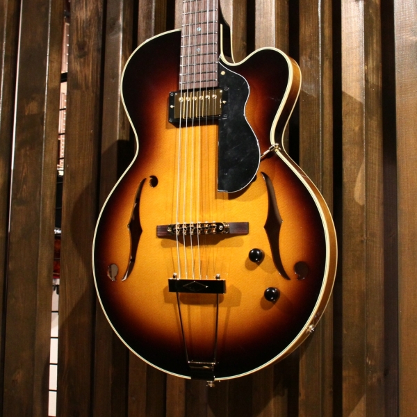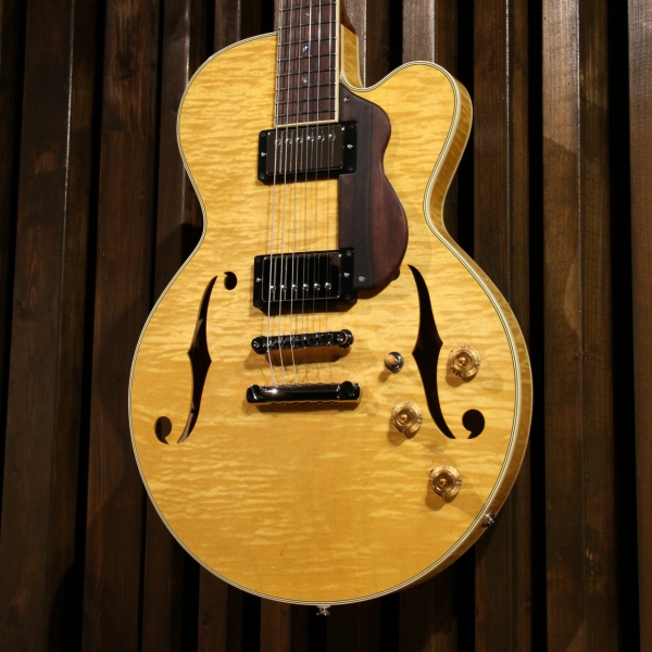 オーダーの内容としては、フルアコとセミアコの中間のギターをお願いしました。希望通りのギターが出来上がりました。大音量の状況でもハウリングに強く、ジャズセッションなどに持っていくのも小ぶりのボディーで大変重宝しています。塗装はウレタンを厚めに塗ってもらっているので、屋外の演奏でも気兼ねなく使えます。